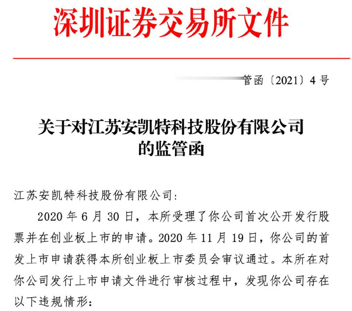 2021年6月,深交所发出监管函,因上述事项构成违规,对安凯特采取书面警示的自律监管措施。