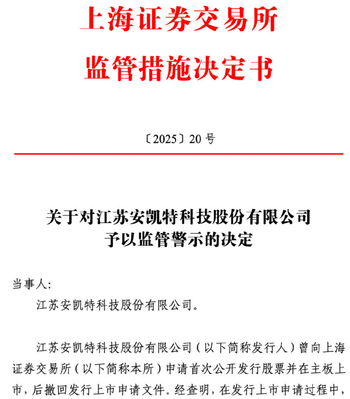 4月8日,上交所在官网公布了三份《监管措施决定书》,对IPO撤回企业江苏安凯特科技股份有限公司(下称“安凯特”)、保荐代表人刘奎波、臧黎明、签字会计师夏先锋、樊略分别予以监管警示。